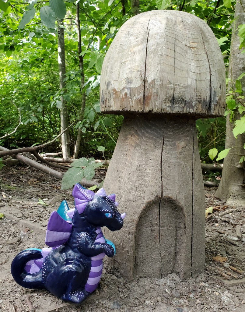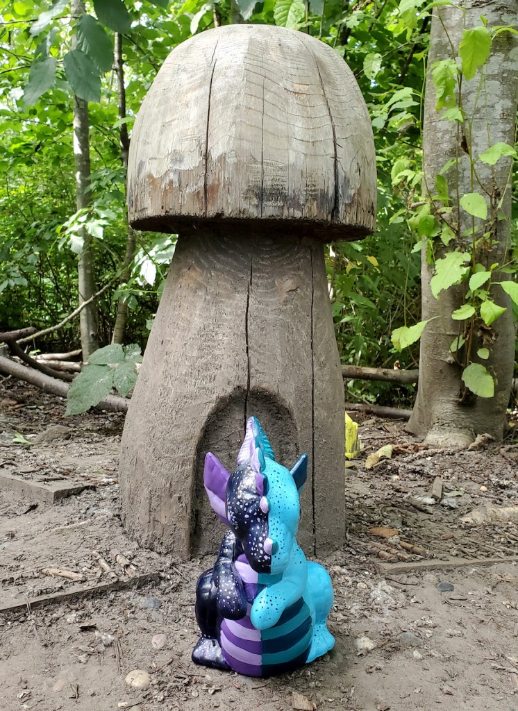 When I first found this guy, who I dubbed Duo the Dragon, he was in a thrift store in Burnaby and was a pretty ugly red colour all over (don’t have any “before” photos sadly!). After buying Duo I gave him a paint job. That was years ago, and this summer I finally “released” him into the Spirit Trails (local trails filled with wood sculptures). Despite walking there regularly, I haven’t seen Duo since, so I expect someone took the lil guy home with them! 🐉 🏠